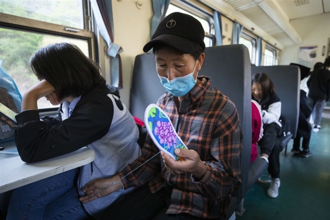 ↑在5633次列车上,一名彝族乘客在制作彝绣鞋垫(4月11日摄)。