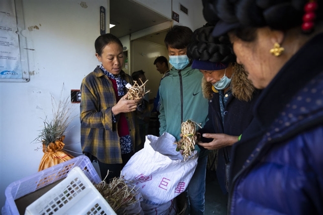 ↑在5633次列车上的“流动集市”,一名彝族妇女(前右)在挑选折耳根(4月11日摄)。