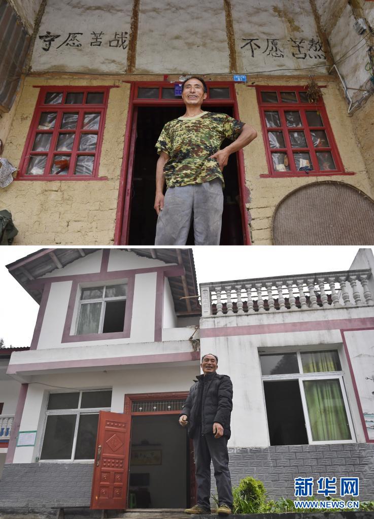 拼版照片:上图是2016年8月22日,李国芝在老房门前留影,墙上有他写的“宁愿苦战 不愿苦熬”八个大字;下图是2020年4月2日,李国芝在他现在居住的新房前留影。