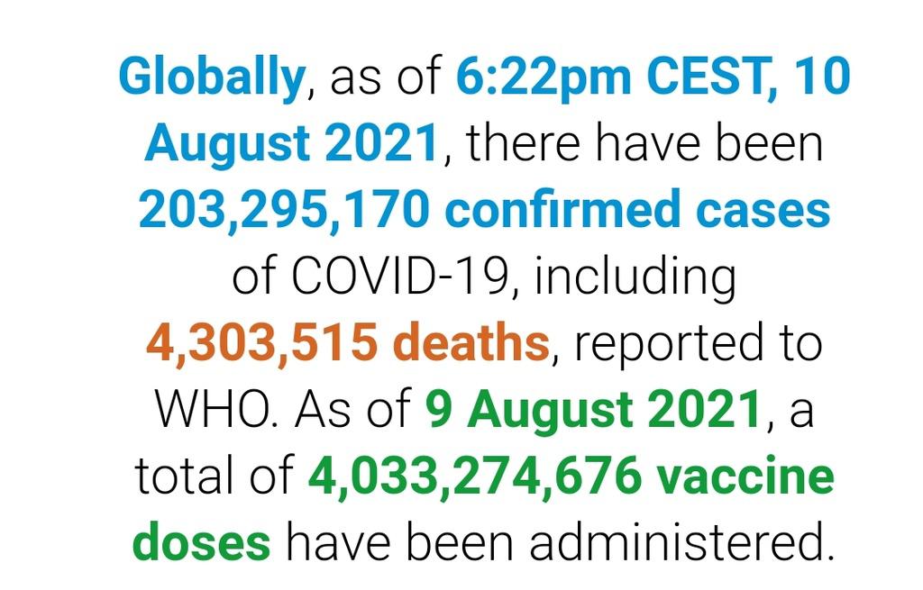 根据世卫组织最新实时统计数据,截至欧洲中部夏令时间8月10日18时22分(北京时间8月11日0时22分),全球累计新冠肺炎确诊病例203295170例,累计死亡病例4303515例。10日全球新冠肺炎确诊病例新增560850例,死亡病例新增8426例。
