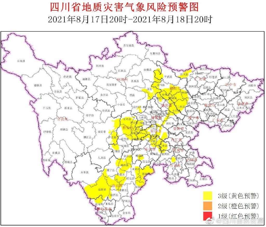 时间:2021-08-18 11:20:20 来源:四川在线8月17日,四川省地质灾害指挥部办公室根据四川省地质环境条件,结合四川省气象台天气预报情况,发布地质灾害气象风险预警:8月17日20时至8月18日20时,全省有13市(州)67个县(市、区)进入黄色预警范围。