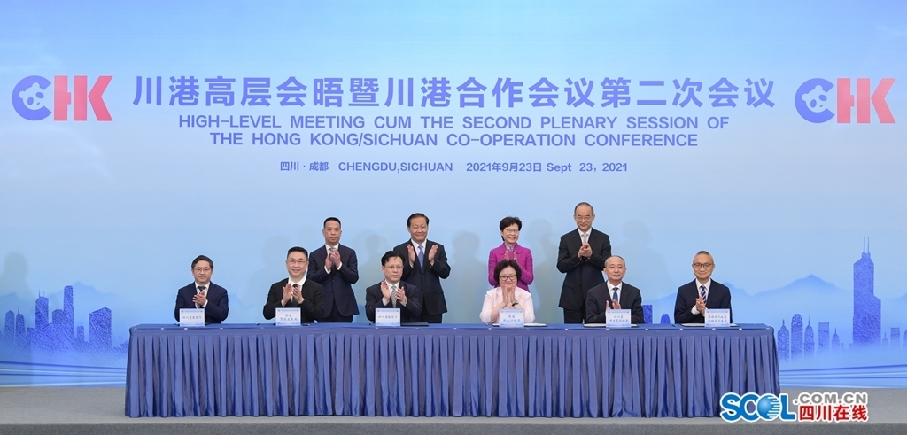 9月23日上午,川港高层会晤暨川港合作会议第二次会议在成都召开,四川省人民政府与香港特别行政区政府签署《川港高层会晤暨川港合作会议第二次会议备忘录》和有关重点领域合作协议。省委书记彭清华、香港特别行政区行政长官林郑月娥、国务院港澳办副主任黄柳权出席会议并致辞,共同见证备忘录和协议签署。省委副书记、省长黄强主持会议,省委副书记邓小刚出席。