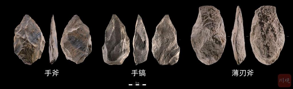 这些不同时期的地层,均有石器出土。4层以下发现了石核、砍砸器、重型刮削器等砾石石器组合,3层发现了手斧、薄刃斧等阿舍利工业石器,二层的石制品主要有两种,一种是石英质的小石片石器,另一种则是小型两面器。不同文化层的平面上也可以看到早期人类的活动面,有人工用火和加工石器的迹象。整个遗址,完整展示了砾石石器-手斧-石片石器的旧石器文化发展序列。尤其值得一提的是,不同地层可以明显看到冷暖交替现象,但即使在气候冷期,地层也有遗物发现,说明早期人类在高海拔地区的活动频率和活动强度非常高,这就突破了以往认为早期人类只有在暖期即气候比较好的阶段才能登上高原的认识。