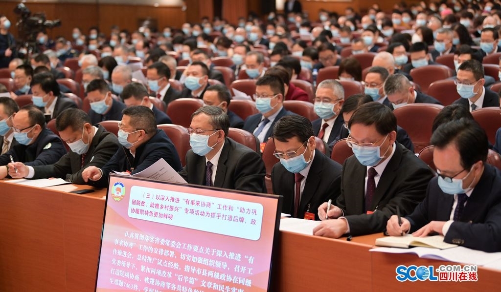 报告指出,一年来,省政协及其常委会牢牢把握加强思想政治引领、广泛凝聚共识这一中心环节,切实肩负实现大团结大联合的政治责任,以学习贯彻中共十九届六中全会精神和开展党史学习教育为重点凝心铸魂,聚焦学史明理、学史增信、学史崇德、学史力行,扎实深入开展党史学习教育和庆祝中国共产党成立100周年系列活动,团结引导广大委员和各族各界人士筑牢坚决拥护“两个确立”、坚定践行“两个维护”的思想政治根基。牢牢把握立足新发展阶段、贯彻新发展理念、融入新发展格局、推动高质量发展,围绕贯彻中央和省委经济工作会议精神,聚焦“战略牵引”,助推成渝地区双城经济圈建设;聚焦“第一动力”,助力创新驱动引领高质量发展;聚焦“风险防范”,协力常态化疫情防控和安全生产;聚焦“绿色发展”,助推美丽四川建设;聚焦“急难愁盼”,助解群众操心事烦心事揪心事,建言成果得到高度重视,凝聚共识取得新的成效。省政协及其常委会以深入推进“有事来协商”工作和“助力巩固脱贫、助推乡村振兴”专项活动为抓手打造品牌,政协履职特色更加鲜明;以坚持和加强党对政协工作的全面领导为根本保证,政协党建和专门协商机构建设更加有力。