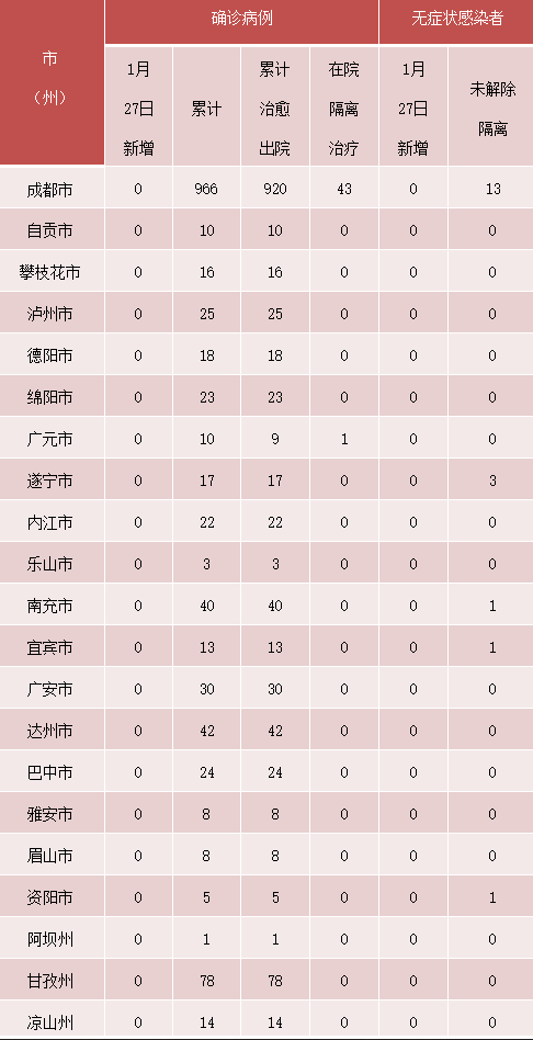 时间:2022-01-28 08:47:11 来源:健康四川官微1月27日0-24时,四川无新增新型冠状病毒肺炎确诊病例,无新增治愈出院病例,无新增疑似病例,无新增死亡病例。