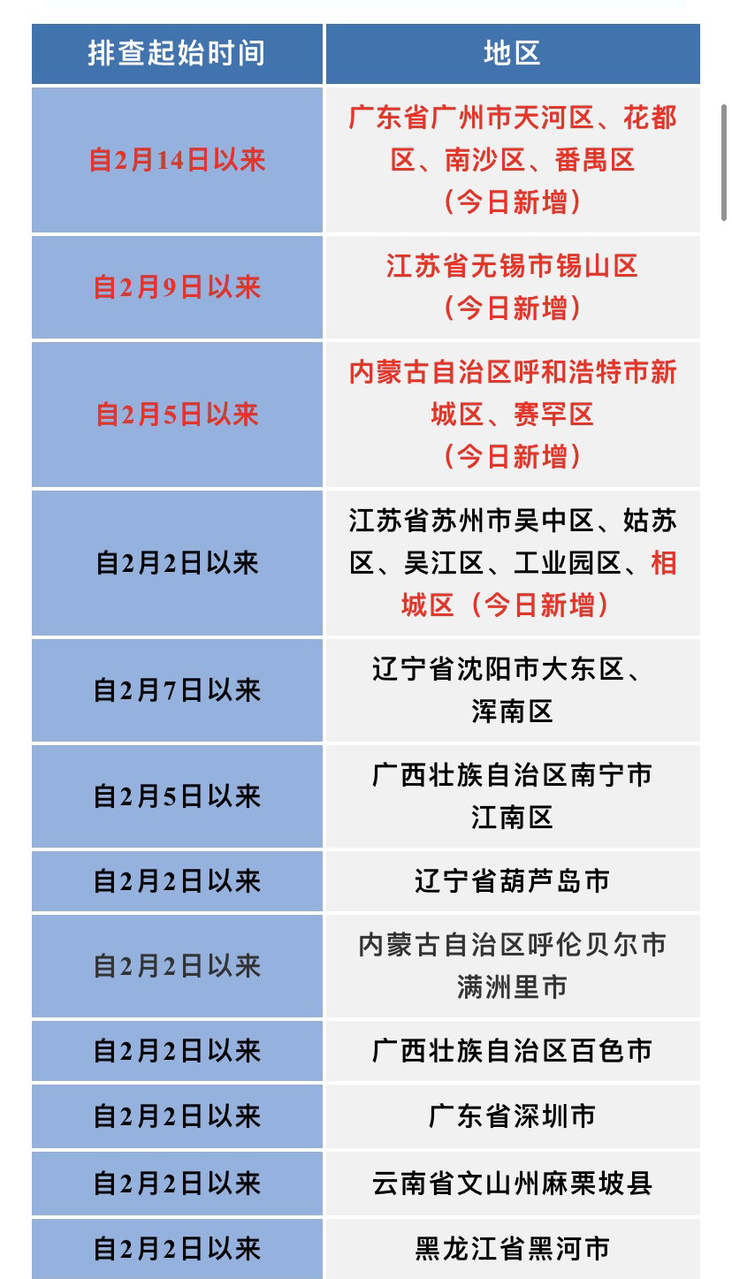如果您近期有以下地区的旅居史,请第一时间向村(社区)、单位或入住酒店报备,配合做好各项疫情防控工作。