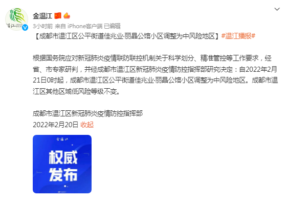 根据国务院应对新冠肺炎疫情联防联控机制关于科学划分、精准管控等工作要求,经省、市专家研判,并经成都市温江区新冠肺炎疫情防控指挥部研究决定:自2022年2月21日0时起,成都市温江区公平街道佳兆业·丽晶公馆小区调整为中风险地区。成都市温江区其他区域低风险等级不变。