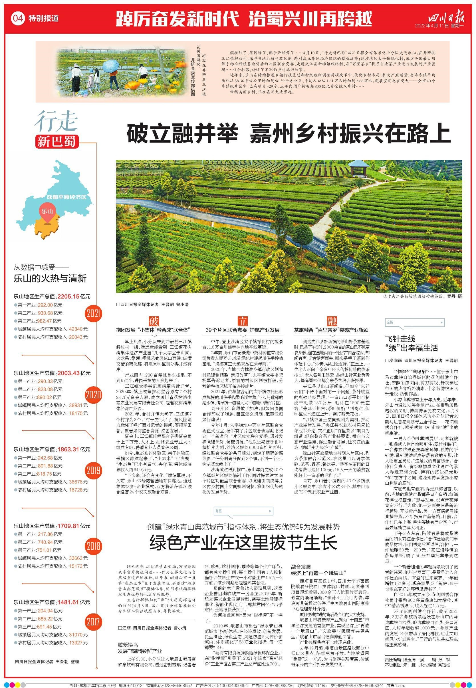 近年来,乐山在持续推进乡镇行政区划和村级建制调整两项改革中,优化乡村布局、扩大产业增量,全市乡镇平均面积从58.36平方公里增加到96.39平方公里、平均人口从1.61万人增加到2.66万人。发展空间也在变大——全市40个乡镇级片区中,已有项目429个,五年内预计将有超800亿元资金投入乡村……