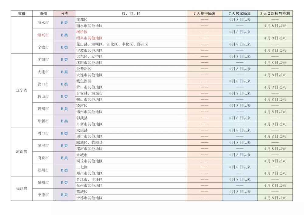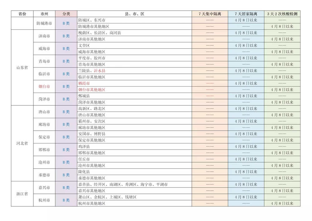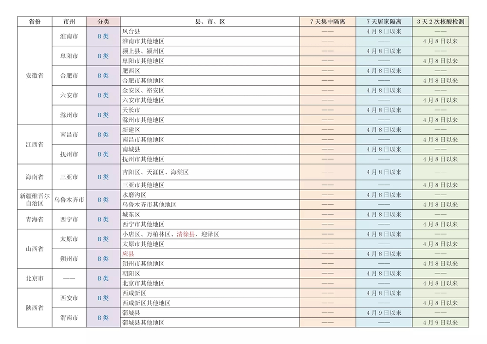 A、B类地区具体名单及相应管控措施