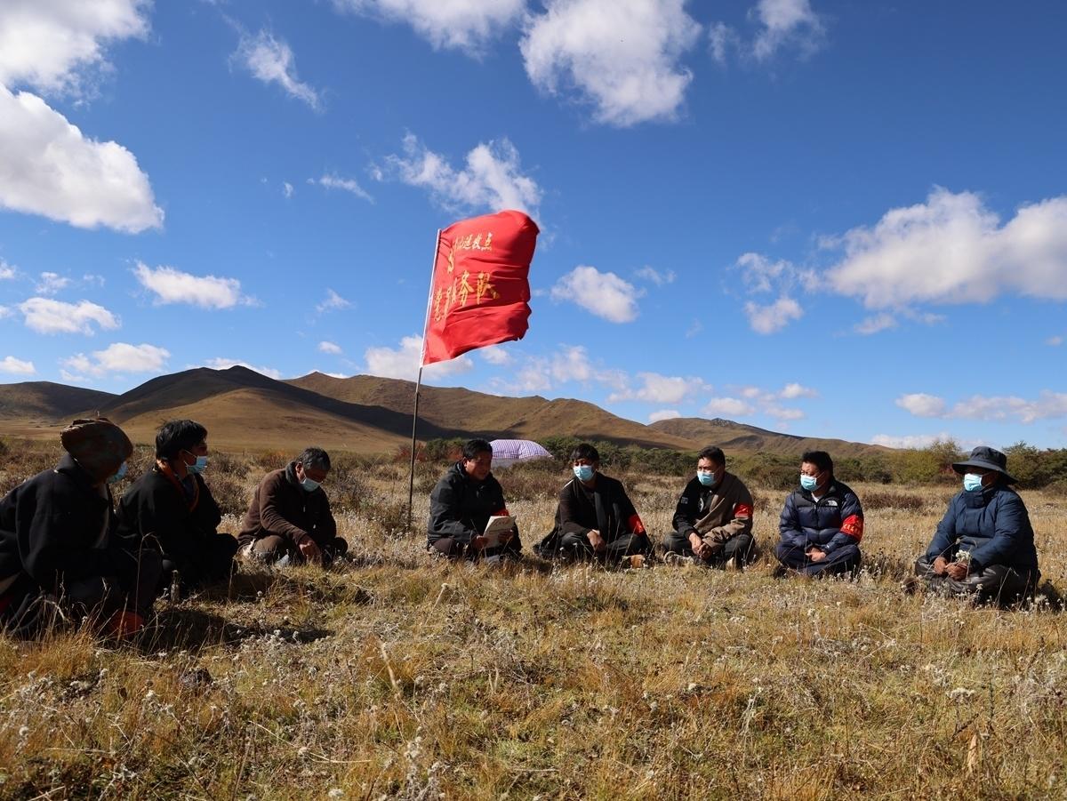 这天上午10点过,顶着明晃晃的太阳,贾洛镇党委副书记罗建平带着村干部来到勒坤玛村远牧点,与牧民一道学习党的二十大报告。