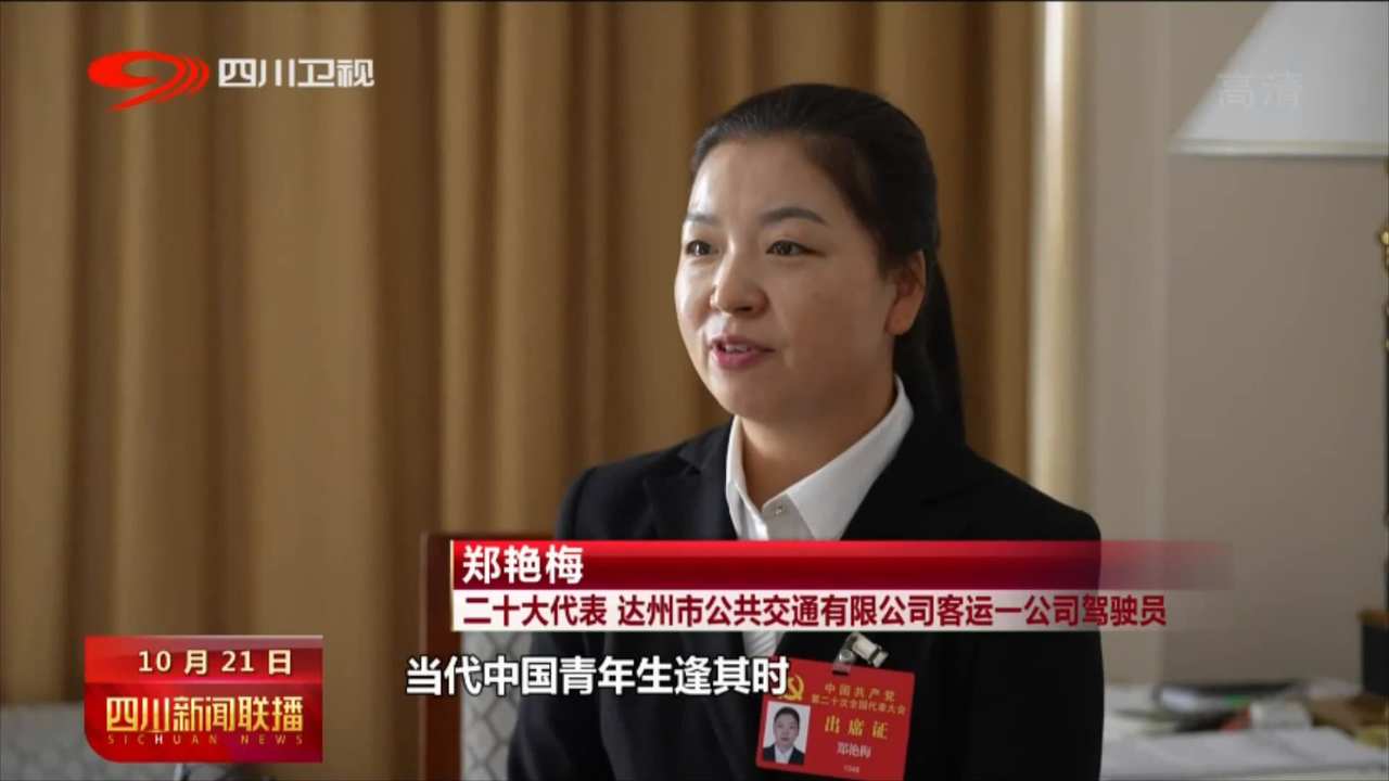 二十大代表 达州市公共交通有限公司驾驶员 郑艳梅:当代中国青年生逢其时,施展才干的舞台无比广阔。(我将)履行好党代表职责,以爱为底色,以真为标准, 积极引导广大青年职工,牢记服务理念,把好安全方向盘。