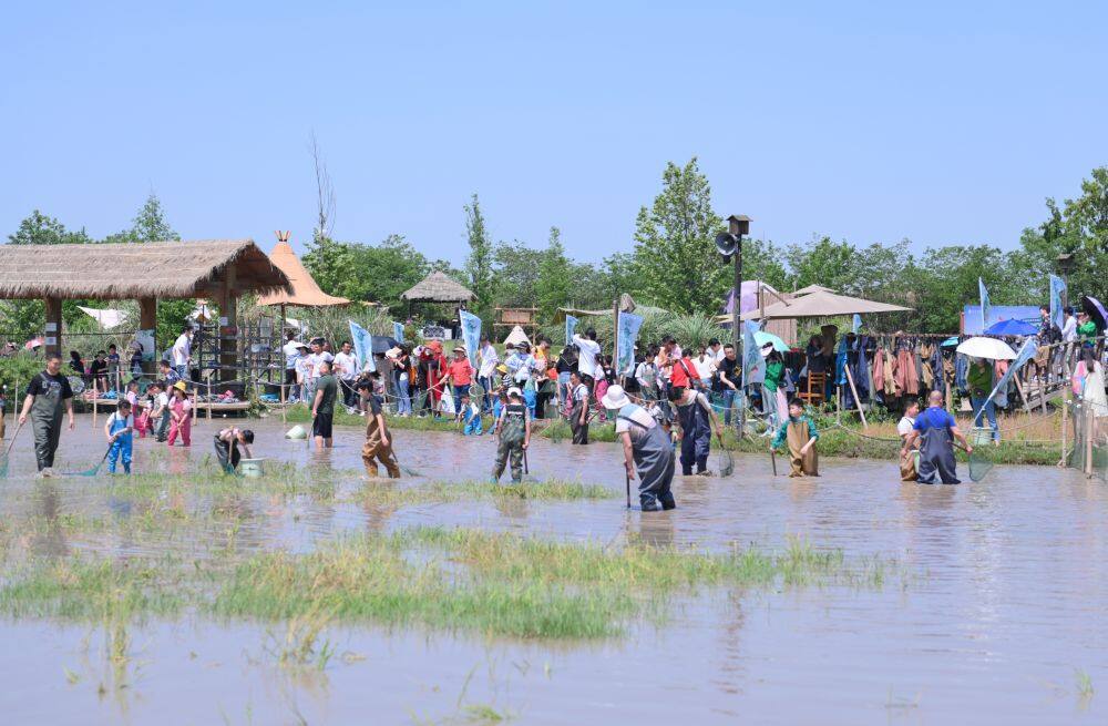 游客在鱼塘里体验捉鱼比赛。新华社记者 袁波 摄