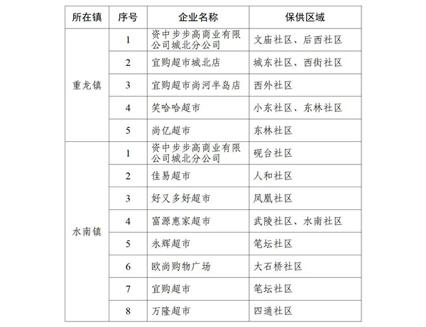 经县商务合作局在县城区内确定16家规模较大、服务较好、配送渠道完善的保供企业负责生活物资组织、配送,具体名单如下: